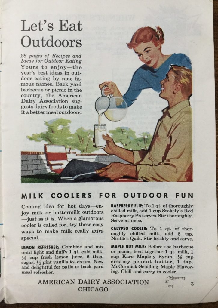 It’s a marketing strategy cleverly disguised as a cookbook: each page of recipes or “eating outdoors” tips features a specific product, without which, of course, not only your meal but your whole picnic or camping trip will be a failure. Of course you must use “Karo” brand corn syrup – that’s the only one that will make your flapjacks “outdoor good!”