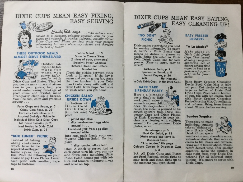 “Emily Post says…An outdoor meal should be a pleasant, relaxing occasion both for your guests and yourself. Attractive, informal, socially correct Dixie Cups and Plates can help make your outdoor entertaining far more pleasantly relaxed and there fore in the best of taste.”