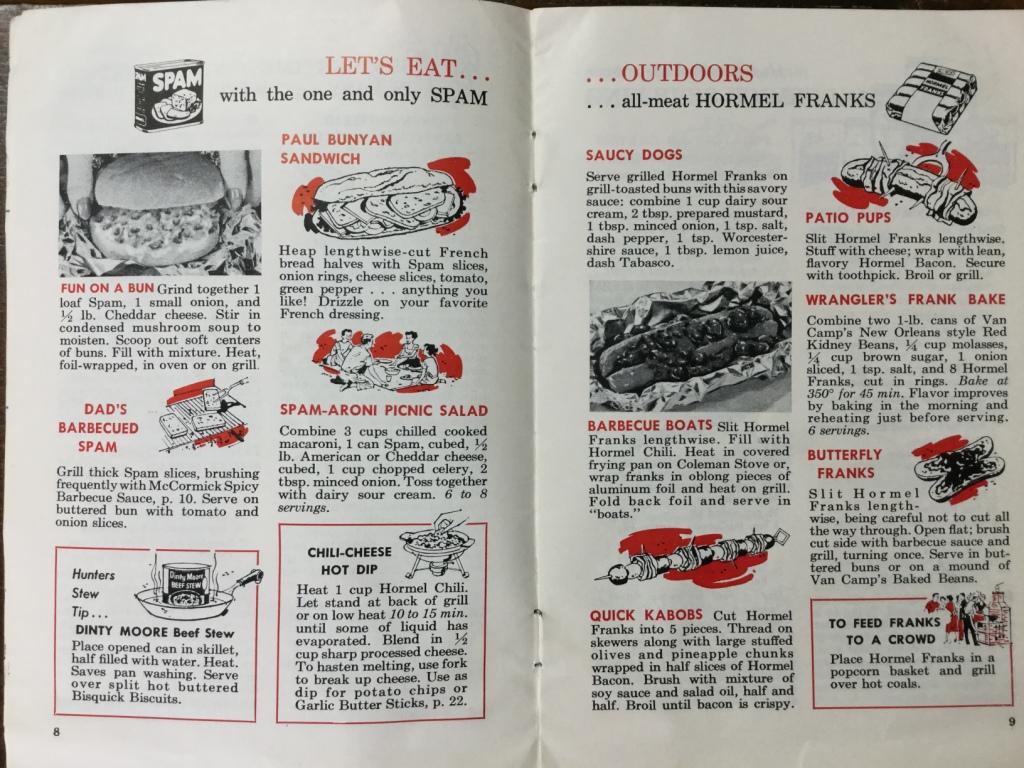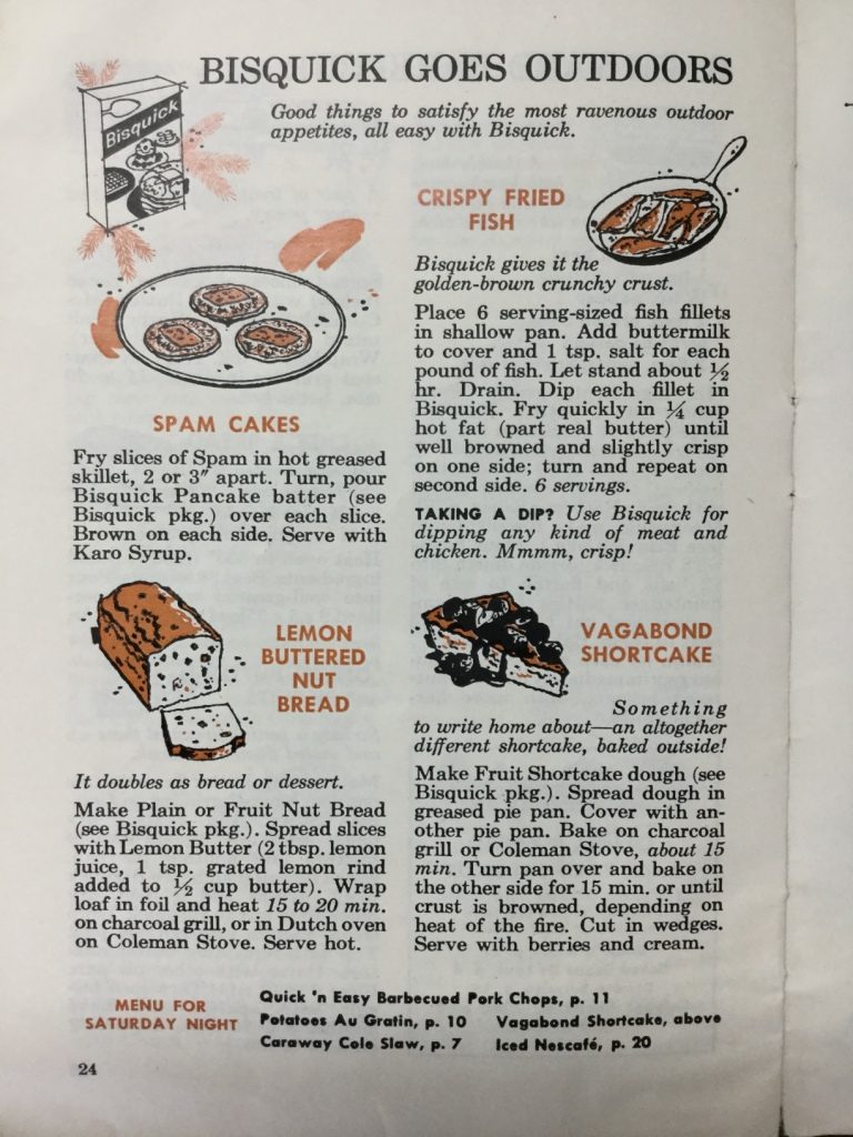 “Bisquick goes outdoors!” proclaims the headline on page 24. Yes, I am inclined to agree – I have enjoyed many a Bisquick pancake cooked on a Coleman stove. This page includes the suggestion of “Spam Cakes” – Bisquick pancake batter poured over fried slices of Spam and served with Karo syrup – and I confess I’m slightly less enthused about that idea (though we seem to have Spam theme going here).