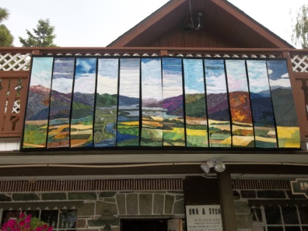 (I’m not putting photos of them here, partly because they’re too big to take photos of and partly because if I do, you won’t need to come down! But here’s a photo of a stunning modern quilt, made by the Fibre Artisans who meet here at the Museum. It’s called “A Slice of Creston, and it’s now on display at Fly in the Fibre. You really should go see it, too.)
