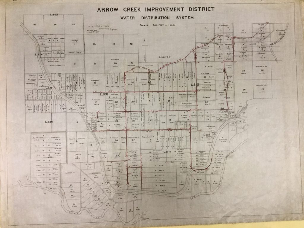 This is from 1926, and shows the planned placement of irrigation pipes for the Arrow Creek Improvement District… that is to say, most of Erickson. This is the system that went into operation in 1930, and which is still in use today – though much of the original concrete pipe has now been replaced.