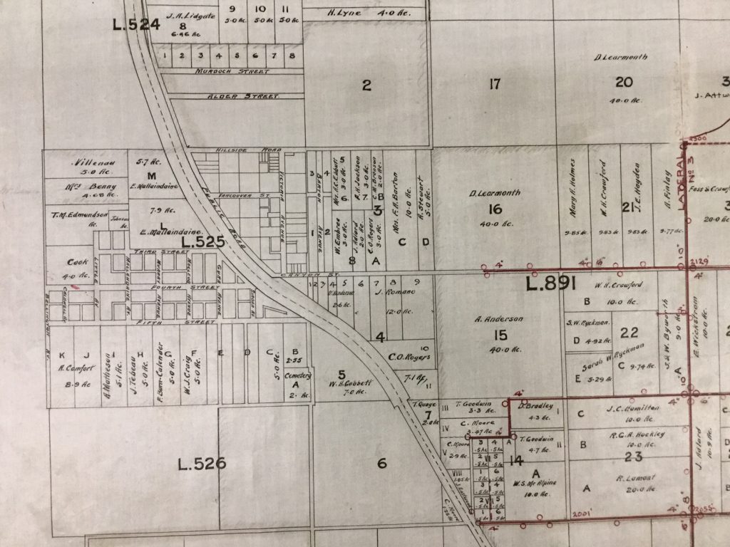 Showing the main part of town. Canyon Street runs left to right across the centre – just above the ‘L.891″ marking. The D. Learmonth property (marked 16) is where the Rec Centre is now; A. Anderson (15) is the high school property.