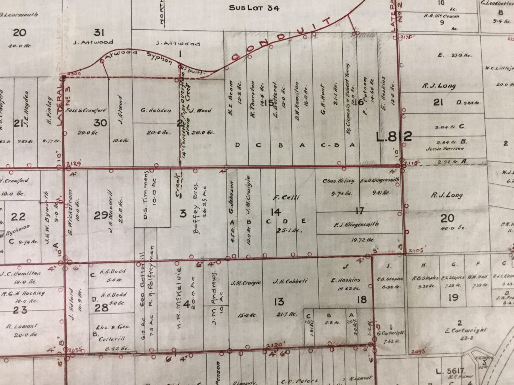 This map is kind of cool because it shows the network of irrigation lines and the extent of the orchard properties it served – but it is really, super, awesomely cool because it also shows the various properties, complete with Lot and Block numbers, and the names of their owners.