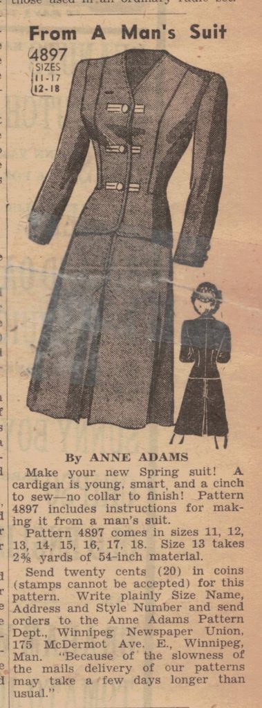 Feeling a little more ambitious? Making do was just as big a thing in the war years as it was during the Depression, and you could even order patterns to make a ladies’ outfit from a man’s suit. The one pictured below is a wonderful example of typical war-time thrift: no collar, partly because that’s easier but also because it saves fabric; no cuffs, no facings, no belts, all for the same reason – and if it had a lining, that would only have been because the original man’s suit it was cut from had a lining. Unfortunately, all we have is the ad for the pattern, not the pattern itself – but maybe you could challenge yourself to make the pattern! Grab a man’s suit (maybe ask the owner first if he minds you cutting it up) and decide: Which pieces will you keep? What needs to be re-cut or re-shaped? Are there any “extra” pieces, and what can you use them for?