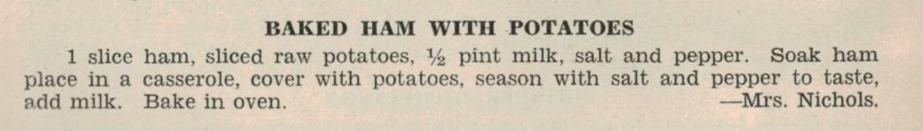 Transcription: 1 slice ham, sliced raw potatoes, 1/2 pint milk, salt and pepper. Soak ham place in a casserole, cover with potatoes, season with salt and pepper to taste, add milk. Bake in oven. (Mrs. Nichols)