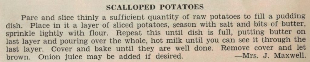 Transcription: Pare and slice thinly a sufficient quantity of raw potatoes to fill a pudding dish. Place in it a layer of sliced poratoes, season with salt and bits of butter, sprinkle lightly with flour. Repeat until dish is full, putting butter on last later and pouring over the whole, hot milk until you can see it through the last layer. Cover and bake until they are well done. Remove cover and let brown. Onion juice may be added if desired. (Mrs. J. Maxwell)