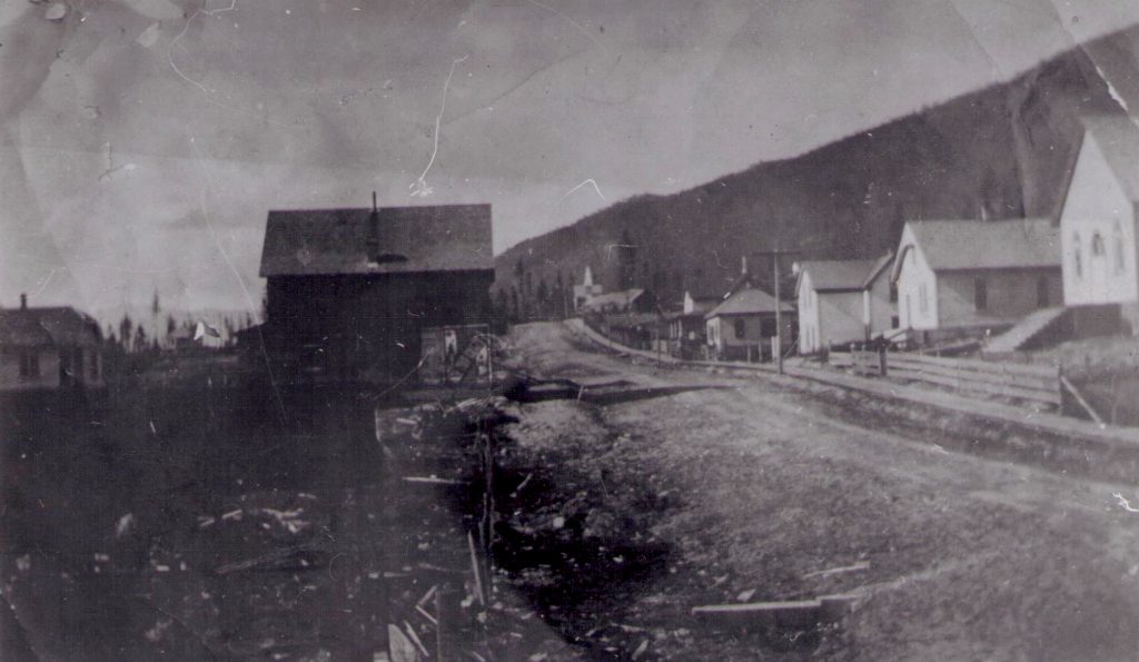 Keep going over to the right, and you’ll see a large, rambling white building with a single tall tree in front of it – the Munro Hotel, now the Kokanee Inn; and the twin-peaked building with the dark roof just behind the cluster of trees on the right is the old Creston Hotel, where the seniors’ centre is today.
