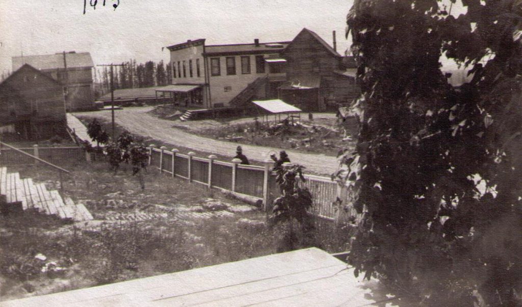 If you look closely under that puff of white steam almost exactly in the centre, you’ll see a steam locomotive pulling into the train station, and the tall building to its left, with the peaked roof and smoke coming from a chimney – that has to be the back of the Mercantile that stood on the corner of 10th and Canyon where the bakery is now. I say “has to be,” because there’s really nothing else it could be, but photos of the back of it are so rare I can’t identify it by comparing it to other photos! But here’s pretty much the only other photo of the back of it I’ve ever seen: